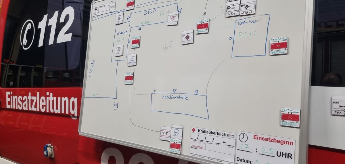 Da auch der Umgang hiermit geübt werden muss, haben sich Gruppenführer Benjamin Lauers und seine Lebensgefährtin eine Lage ausgedacht, die sowohl im Einsatzleitwagen bearbeitet werden musste, als auch außerhalb des Einsatzleitwagen mit dem neuen Koffer als Lagekarte dargestellt werden musste.