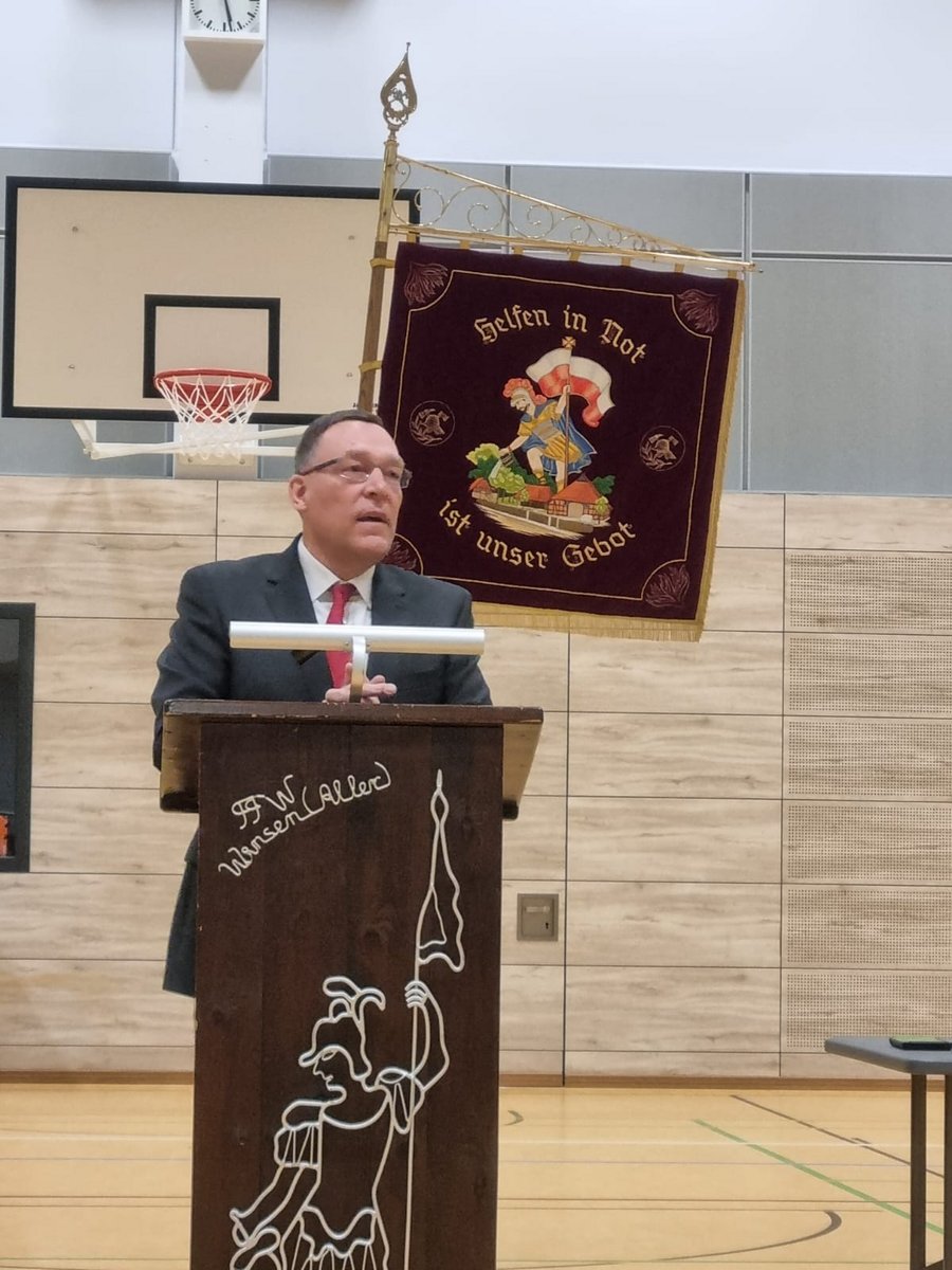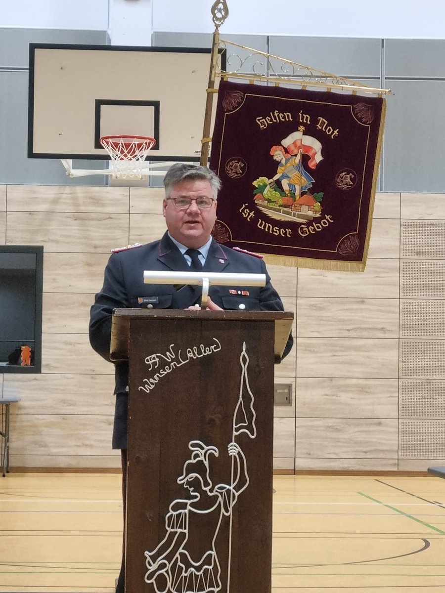 Im letzten Jahr war die Jahresversammlung pandemiebedingt ausgefallen. Dieses Jahr, so erläuterte Marquardt, war die Versammlung notwendig, da der Ortsbrandmeister nach 6 Jahren Amtszeit neu gewählt werden musste. Auf die sonst üblichen Berichte der Funktionsträger wurde bewusst verzichtet, um die Versammlung auf das Notwendige zu beschränken. So gab es zum Einklang der Veranstaltung Grußworte seitens Marquardt und Hermann, sowie durch den Vertreter der Kreisfeuerwehr Lucan und des Bürgermeisters Oelmann. Marquardt und Hermann lobten ausdrücklich das große Engagement der ehrenamtlichen Feuerwehrfrauen und -männer, die trotz der Schwierigkeiten in der Corona-Zeit außerordentlich diszipliniert mit den einzelnen Vorgaben für den Feuerwehrdienst umgegangen sind. Die Einsatzbereitschaft der Ortswehren war in den letzten zwei Jahren zu keiner Zeit gefährdet gewesen und die Ortswehr Winsen (Aller) hat inzwischen eine hohe Impfquote. Marquardt verwies kurz auf die neuen Fahrzeuge, die die Ortswehr in den letzten zwei Jahren erhalten hat, die aufgrund der pandemischen Lage noch nicht offiziell an die Wehr übergeben werden konnten. Dieses soll, sobald es möglich ist, in einem offiziellen Rahmen nachgeholt werden. Hermann lenkte seinen Blick in die Zukunft und sprach unter anderem die kommende neue Bekleidung für die Atemschutzgeräteträger an, sowie den geplanten Neubau eines Feuerwehrhaus in Winsen. Hermann dankt dem Rat und der Verwaltung, die die Feuerwehr als wichtiges Instrument der Gemeinde versteht und mit dem entsprechenden Material ausrüstet.