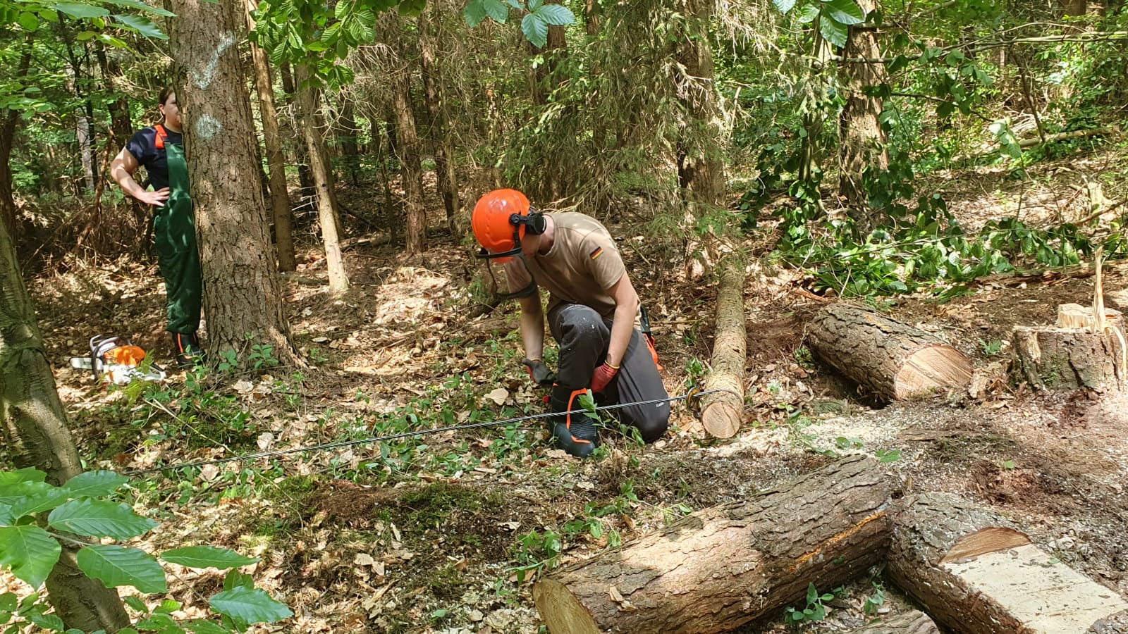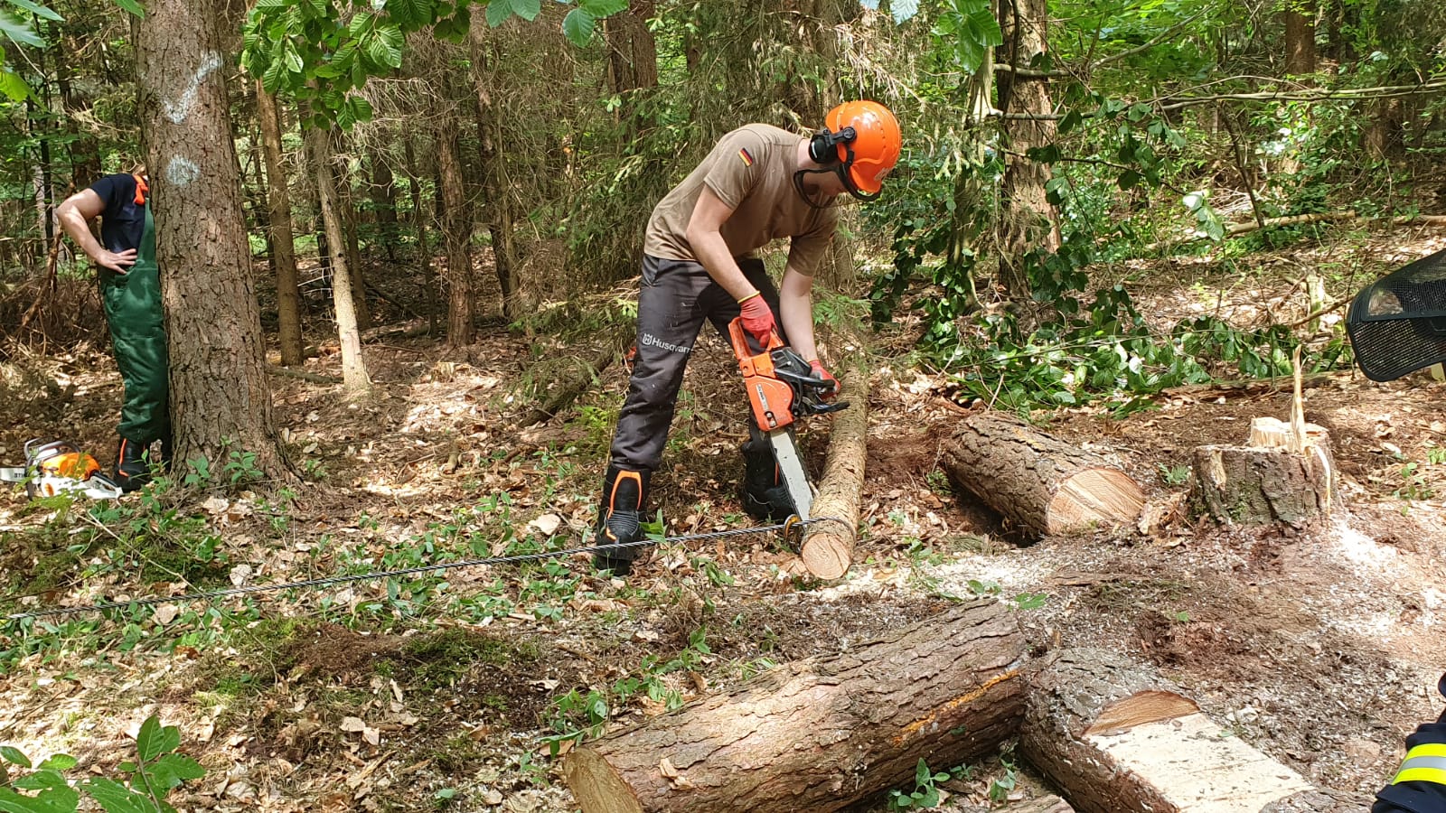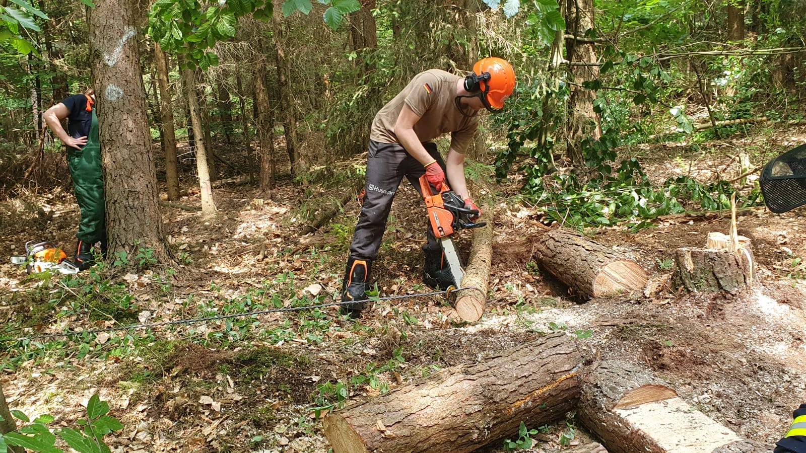 Der praktische Teil fand am nächsten Tag in einem Waldstück bei Papenhorst statt. Hier erlernten die Kameraden verschiedene Sägetechniken, wie einen Fällkerb der zum Fällen von Bäumen benötigt wird. Sägen von Holz unter Spannung sowie liegendes Holz aufarbeiten ist insbesondere bei Sturmschäden erforderlich, wie zum Beispiel umgestürzte Bäume, von denen eine Gefahr ausgehen kann. So fokussierten sich die Teilnehmer insbesondere auf Sägearbeiten am liegenden Holz.