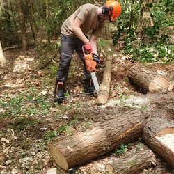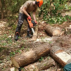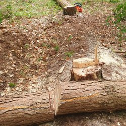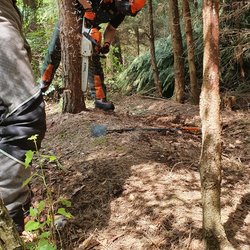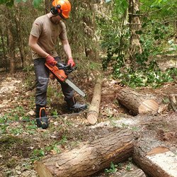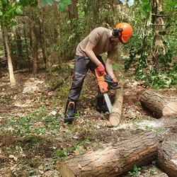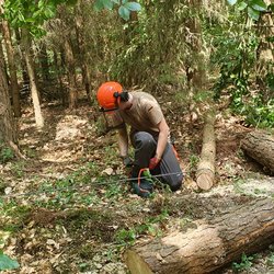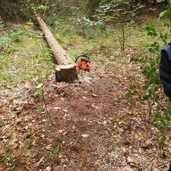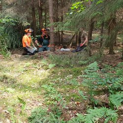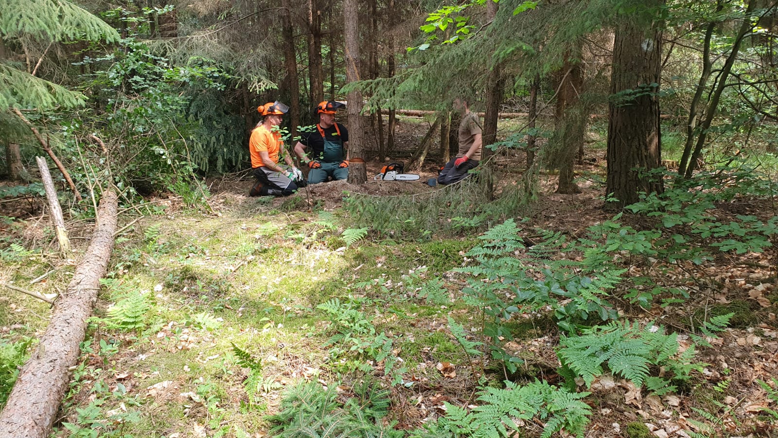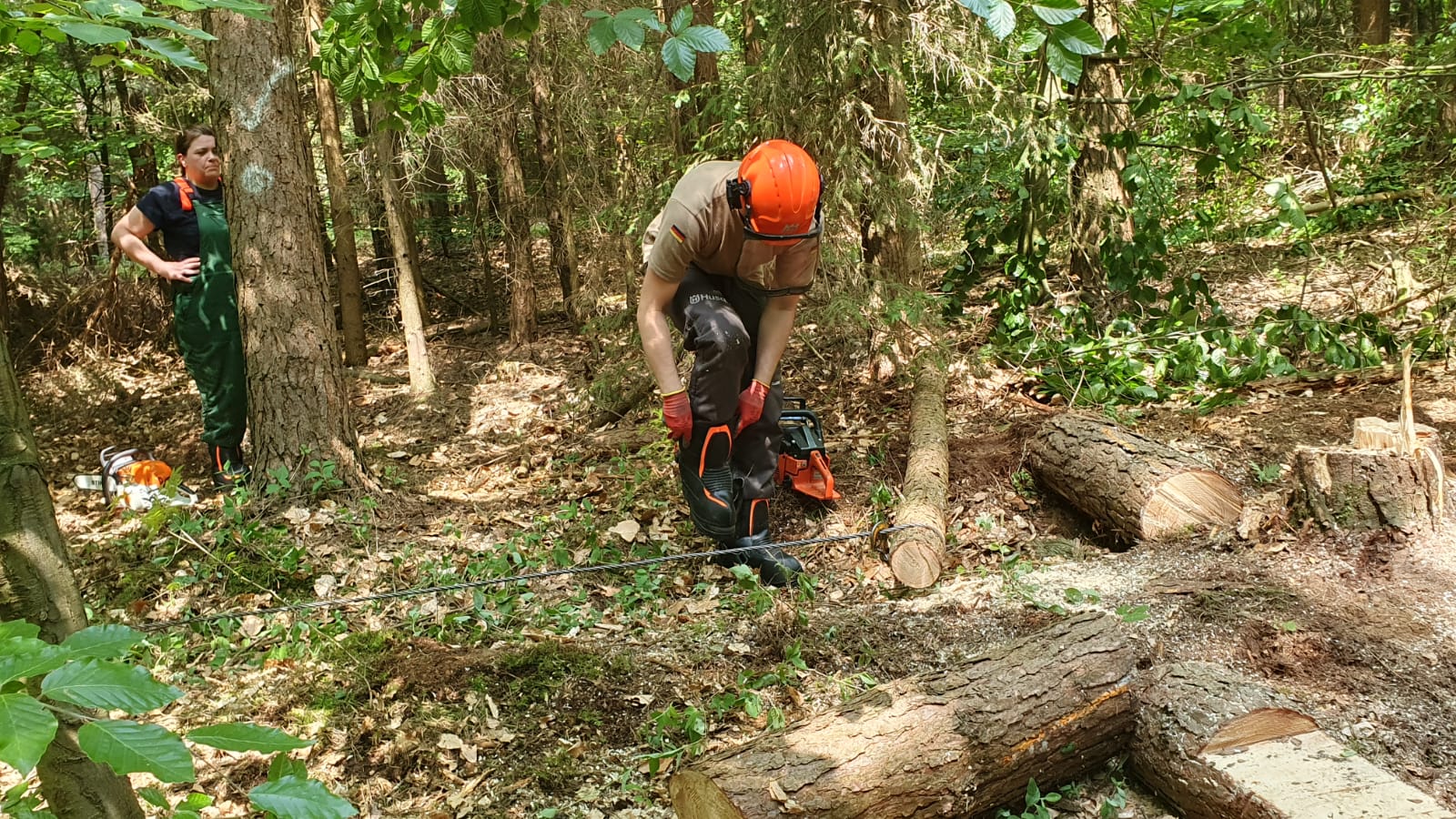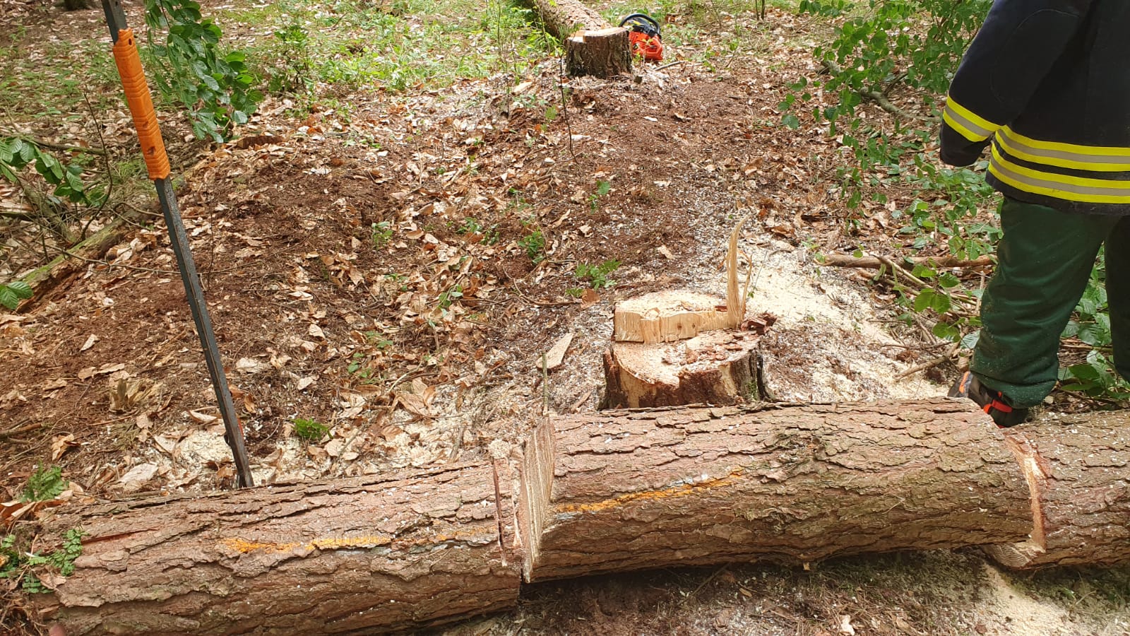 Der praktische Teil fand am nächsten Tag in einem Waldstück bei Papenhorst statt. Hier erlernten die Kameraden verschiedene Sägetechniken, wie einen Fällkerb der zum Fällen von Bäumen benötigt wird. Sägen von Holz unter Spannung sowie liegendes Holz aufarbeiten ist insbesondere bei Sturmschäden erforderlich, wie zum Beispiel umgestürzte Bäume, von denen eine Gefahr ausgehen kann. So fokussierten sich die Teilnehmer insbesondere auf Sägearbeiten am liegenden Holz.