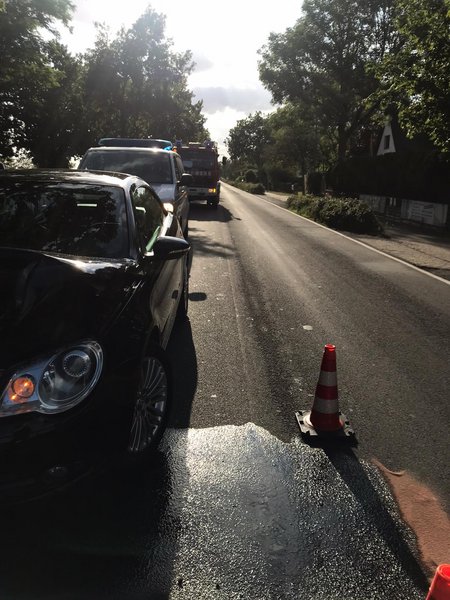 Ein Fahrzeug war auf ein weiteres Fahrzeug aufgefahren, hierbei traten Betriebsstoffe aus dem Fahrzeug aus, die durch die Feuerwehr gesichert wurden. Die Straße wurde anschließend durch eine Fachfirma gereinigt.