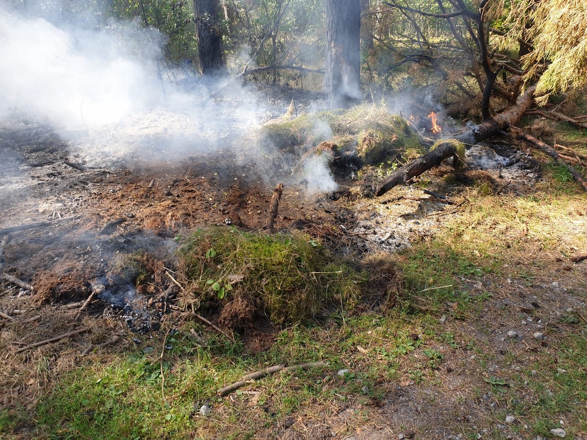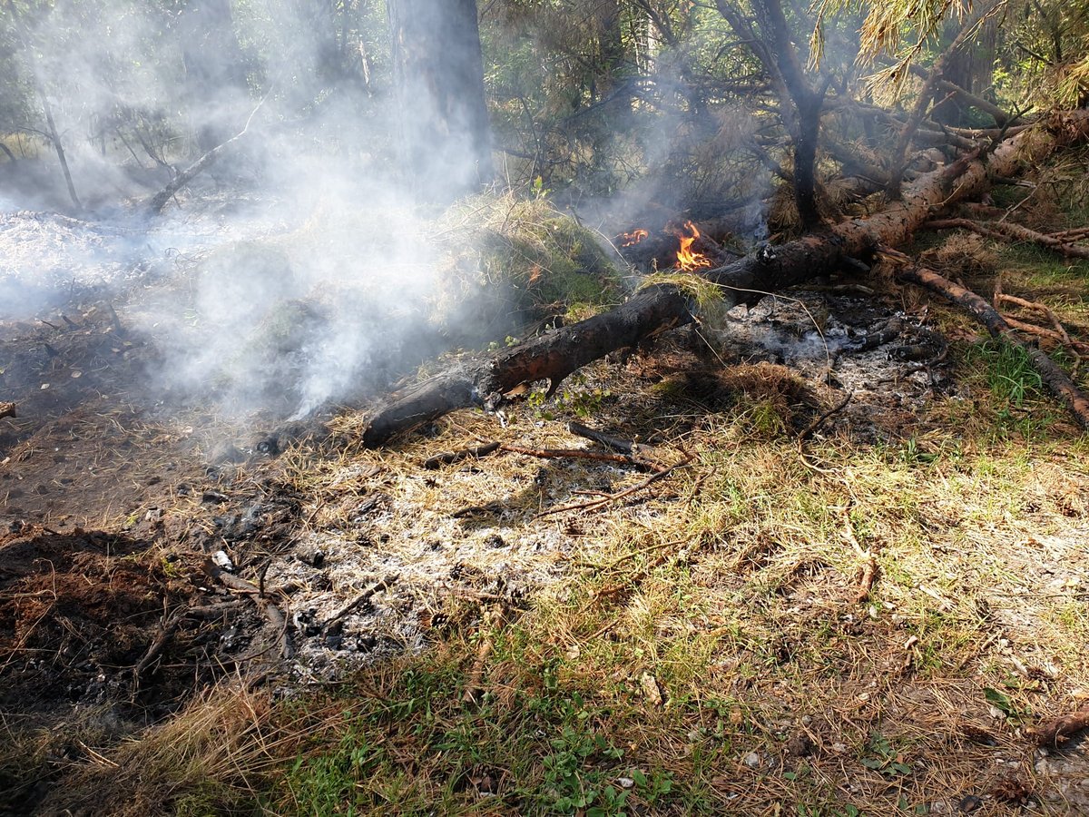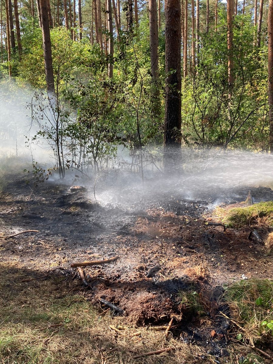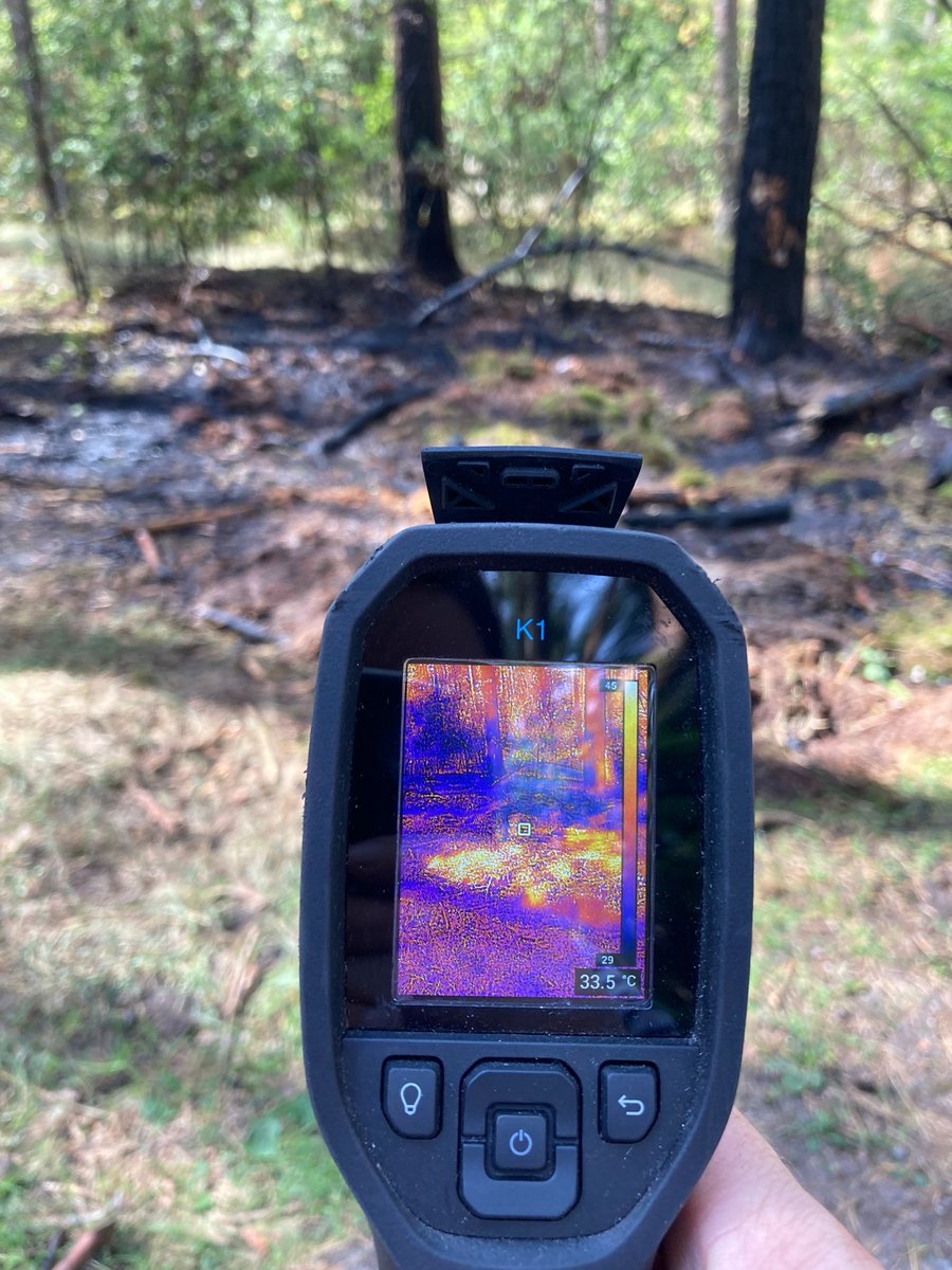 Die Feuerwehr übernahm die Nachlöscharbeiten. Hierzu wurde der Waldboden mit Grubbern aufgelockert und mit 2 C-Rohren gewässert. Anschließend wurde der Bereich mit einer Wärmebildkamera untersucht, bis die Temperaturen im verbrannten Holz und Waldboden ausreichend gesenkt waren.