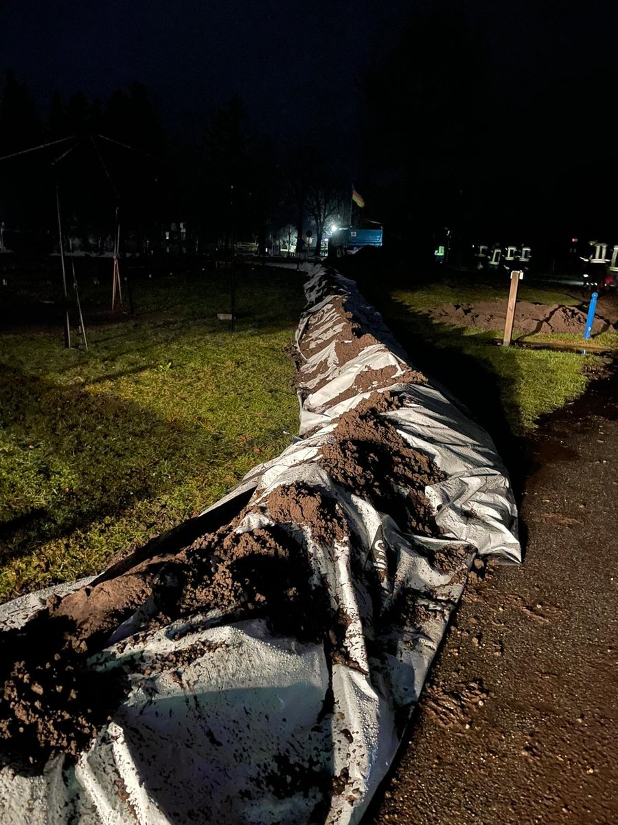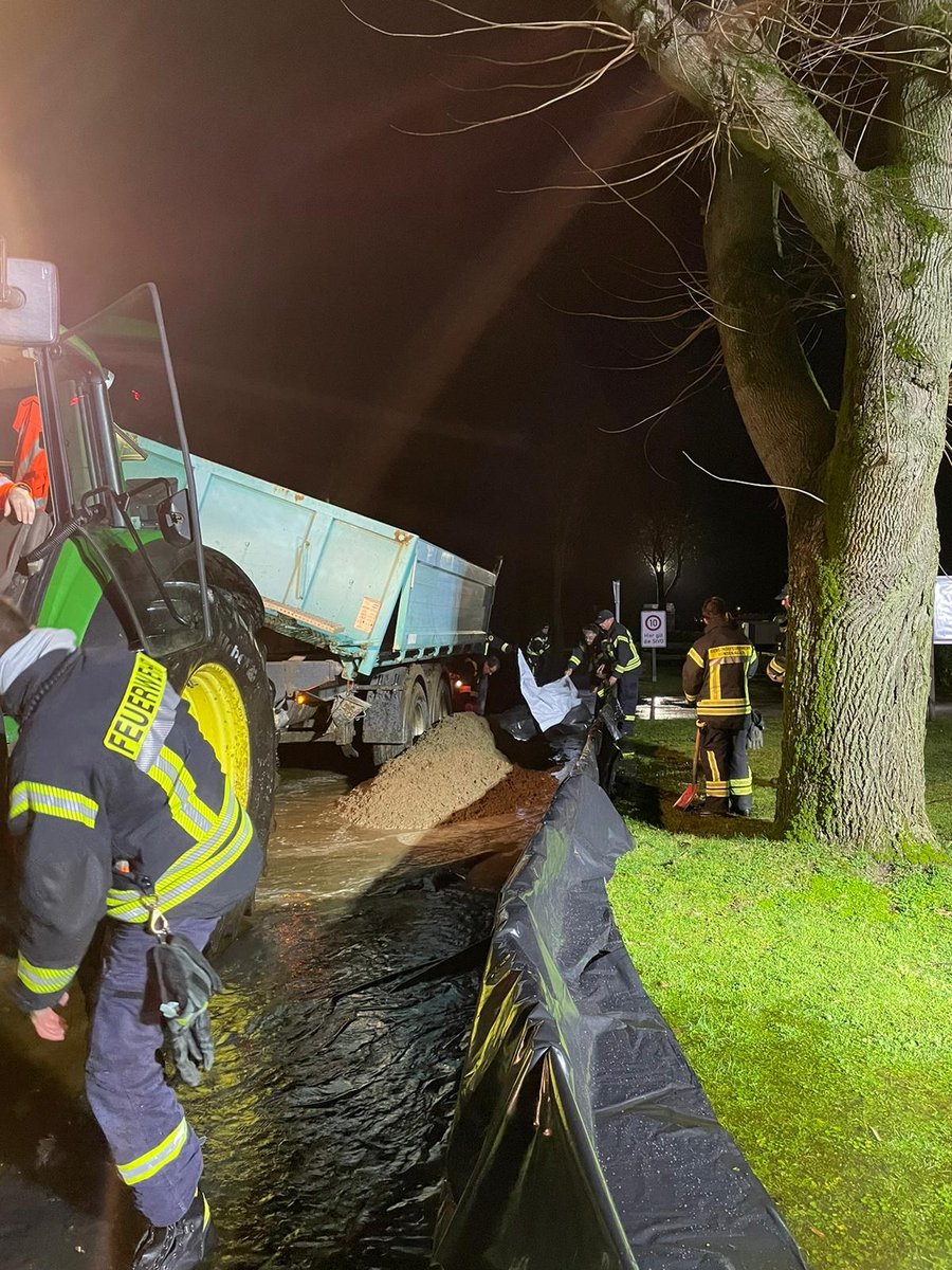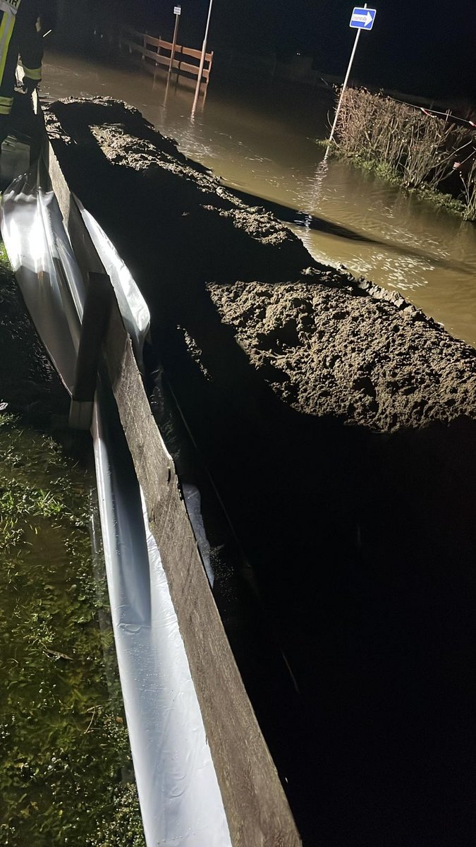Am 25.12.2023 wurde die Feuerwehr Winsen (Aller) am Nachmittag auf einen Campingplatz an der Aller gerufen. Die Aller stand bereits weit über die Ausgleichflächen, so dass einzelne Gebäudeteile der Anlage vom Wasser bedroht wurden. Es wäre unmöglich gewesen, einen Schutzwall nur mit Sandsäcken und Manpower zu errichten. Daher wurde schweres Baugerät an die Einsatzstelle geschafft. Mehrere Traktoren mit Anhänger fuhren Sand auf das Gelände, der mit Radladern auf eine ca. 300m lange Folie verteilt wurde. Mit Handschaufeln wurde anschließend ein gleichmäßiger Wall errichtet, der mit der Folie umschlossen wurde.