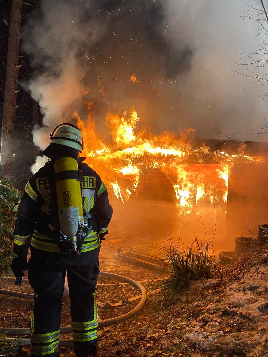 Durch die hohe Brandlast eines Holzhauses konnte das Haus nicht gerettet werden und brannte komplett ab. Die umliegenden Gebäude konnten gehalten werden. Nach mehreren Stunden Einsatzdauer konnten die meisten Kräfte die Einsatzstelle verlassen und einrücken. Eine Brandwache war noch bis in die frühen Morgenstunden vor Ort, um ein erneutes Aufflammen schnell zu löschen. Am Gerätehaus wurden derweil alle Fahrzeuge wieder einsatzbereit gemacht werden.