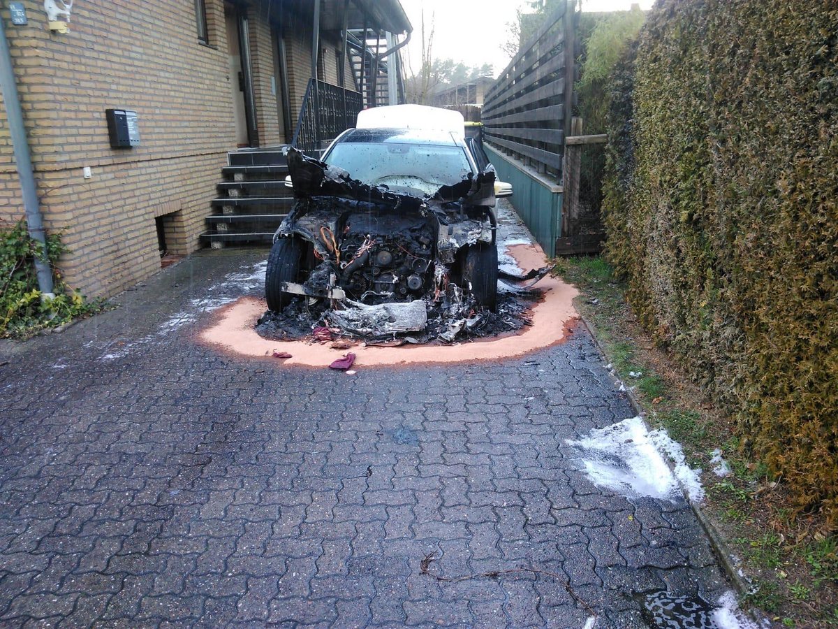 Vor Ort stellten die Kameraden einen ausgedehnten Fahrzeugbrand fest. Da das Fahrzeug direkt zwischen einem Gebäude und einer Hecke stand, wurde vorsorglich die Ortsfeuerwehr Winsen (Aller) nachalarmiert.